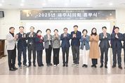 (시사미래신문) 파주시의회는 12월 31일 오후 2시, 파주시의회 1층 세미나실에서 2025년 종무식을 개최하면서 우수의원 표창에 대한 표창 전수식을 진행했다. 우수의원 표창은 대한민국 시·군자치구의회의장협의회장 표창 1건, 경기도 시·군의회의장협의회장 표창 3건, 경기도 북부시·군의장협의회장 표창 3건으로, 2025년 한 해 동안 의욕적인 의정활동을 펼친 지방의회 의원의 노고를 격려하고 우수한 의정활동 사례를 알리고자 마련됐으며, 각 협의회장을 대신해 파주시의회 박대성 의장의 대독 전수로 수여됐다. 먼저, 손성익 의원은 지방의회 의원으로서 투철한 사명감과 봉사정신을 발휘하여 의정 발전과 주민 화합을 위해 노력한 공으로 대한민국 시·군자치구의회의장협의회 대한민국지방의정봉사상 수상의 영예를 안았다. 이어서, 이익선 의원(공약실천 부문), 이정은 의원(의정활동 개선 부문), 오창식 의원(행정감사 부문)은 적극적인 의정활동을 펼친 공로가 인정되어 경기도 시·군의회 의정활동 우수의원 수상자로 선정됐다. 마지막으로, 이혜정 의원(행정감사 부문), 윤희정 의원(의정활동개선 부문), 최유각 의원(지역경제활성화