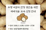 (시사미래신문) 당진시는 오는 3월 3일 오후 1시 30분 당진시농업기술센터 중강의실에서 씨감자 추백 재배 농가 및 교육 희망자 50여 명을 대상으로 ‘우량 씨감자 안정 생산을 위한 재배기술 교육’을 실시한다고 24일 밝혔다. 이번 교육은 건전한 씨감자 생산을 위한 재배 환경 관리와 병해충·바이러스 방제 기술을 전수하고, 종서 생산 단계별 표준 재배 기술 정립 및 품질 균일화를 위해 진행한다. 특히 교육에는 충청남도 스마트농업본부 종자산업과의 조만현 박사가 강사로 나서 전문성 높은 강의를 한다. 주요 교육 내용은 재배 환경 관리 요령 등이며, 실제 영농 현장에서 겪는 애로사항에 대한 질의응답을 통해 실질적인 해결 방안을 제시할 예정이다. 한편, 당진시는 충청남도 스마트농업본부와 연계해 조직배양 기반의 ‘추백’ 씨감자를 체계적으로 생산·공급했으며, 바이러스 무병 씨감자 망실재배 시범 사업을 도입해 건전 종서를 안정적으로 생산하기 위해 노력해 왔다. 농업기술센터 관계자는 “씨감자는 지역 감자 산업의 경쟁력을 좌우하는 핵심 자원”이라며, “이번 교육을 통해 건전 종서 생산기술을 농가에 체계적으로 보급해