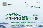 (시사미래신문) 전남 구례군은 아름다운 자연환경을 배경으로 한 ‘제1회 구례 지리산봄길 마라톤대회’가 오는 5월 2일 구례공설운동장에서 개최된다고 밝혔다. 이번 대회는 오마이뉴스 광주전라본부와 구례군육상연맹이 주최·주관하고 구례군이 후원하는 행사로 마라톤 종목 저변 확대와 구례 지역 홍보를 위해 마련됐다. 대회종목은 하프코스(21.0975km), 10km, 5km 총 3개 부문이다. 참가자들은 오전 8시 30분부터 순차적으로 출발해 지리산의 봄 풍경을 따라 달리게 된다. 참가 신청은 2월 23일부터 공식 홈페이지를 통해 접수를 시작하며, 모집 인원 4,000명 선착순으로 마감된다. 또한 원활한 대회 운영을 위해 자원봉사자도 함께 모집한다. 구례군 관계자는 “제1회 대회인 만큼 참가자 모두가 만족할 수 있도록 지원을 아끼지 않겠다”며 “지역 주민과 전국의 참가자들이 함께 어우러지는 건강과 문화의 축제로 자리매김하길 바란다”고 말했다.