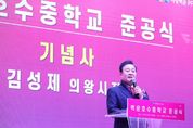 (시사미래신문) 의왕시 백운밸리 지역에 신설된 백운호수중학교의 준공식이 24일 백운호수중학교 체육관에서 개최됐다. 의왕백운프로젝트금융투자(주)(의왕백운PFV(주)) 주최로 열린 이날 준공식에는 김성제 의왕시장, 임태희 경기도 교육감, 김학기 의왕시의회 의장과 도·시의원, 의왕백운피에프브이(주) 김양묵 대표이사, 의왕백운밸리에이엠시(주) 이성훈 대표이사 등 주요 내빈과 지역주민 400여 명이 참석해 자리를 빛냈다. 이번 준공식은 학교 설립을 위해 힘써 온 관계자와 지역 주민들이 한 자리에 모여 그동안의 결실을 함께 나누고 축하하는 뜻깊은 행사로 마련됐다. 의왕시 백운밸리 일대는 주거단지 조성과 함께 인구가 지속적으로 증가하고 있는 지역으로, 그간 중학교 부재에 따른 학생들의 원거리 통학 문제가 꾸준히 제기돼 왔다. 이에, 시는 ‘중학교 신설’이라는 지역 숙원사업 해결을 위해 다각적인 방안을 검토해 왔으며, 2023년 11월 의왕시·군포의왕교육지원청·의왕백운피에프브이(주) 간 3자 업무협약을 체결함으로써 학교 설립이 본격 추진됐다. 협약을 통해 시에서는 백운호수 초등학교 인접 유치원 부지를