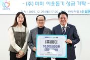 (시사미래신문) 안양시는 지난 29일 ㈜미미로부터 이웃돕기 성금 1천만원을 기탁받았다고 30일 밝혔다. 이날 시청 접견실에서 열린 성금 전달식에는 최대호 안양시장과 조인주 ㈜미미 회장, 조예서 전무 등이 참석했다. ㈜미미는 만안구 덕천로에 소재한 기업으로 용역·청소·경비·주택업·건물종합관리 등 다양한 분야에서 사업을 운영하고 있으며, 지역사회 나눔과 사회공헌 활동에도 꾸준히 동참하고 있다. 이번에 기탁된 성금은 안양시 이웃돕기 성금으로 사용되며, 저소득층 건강보험료 지원과 취약계층 물품 지원 등 관내 어려운 이웃을 돕는 데 활용될 예정이다. 조인주 회장은 “지역사회로부터 받은 사랑을 다시 이웃과 나누고자 성금을 기탁하게 됐다”며 “작은 정성이지만 어려운 분들께 도움이 되기를 바란다”고 전했다. 최대호 안양시장은 “연말을 맞아 따뜻한 나눔을 실천해 주셔서 감사드린다”면서 “성금은 저소득층과 취약계층 등 도움이 절실한 이웃들에게 투명하고 공정하게 전달하겠다”고 말했다.