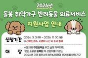 (시사미래신문) 수원특례시는 돌봄 취약가구의 반려동물 양육 부담을 덜고 동물복지를 강화하기 위해 ‘2026년 돌봄 취약가구 반려동물 의료서비스 지원사업’을 추진한다. 지원 대상은 수원시에 주민등록을 두고 실제 거주하며 본인 명의로 반려동물을 등록해 기르는 기준중위소득 85% 이하 가구다. 저소득층, 중증장애인, 한부모가정, 다문화가정, 1인가구 등이 포함된다. 경기도 공공입양기관에서 국가봉사동물을 입양한 경우는 소득과 관계없이 지원한다. 보호자 1명당 2마리까지 신청할 수 있다. 동일 동물은 ‘의료·돌봄·장례 지원’ 또는 ‘노령동물 종합건강검진’ 중 한 가지 항목만 선택해 지원한다. 의료·돌봄·장례 지원은 마리당 최대 16만 원(초과비용 자부담), 노령동물 종합건강검진은 최대 32만 원(초과비용 자부담)까지 지원한다. 노령동물 검진은 2019년 12월 31일 이전 출생한 반려동물에 한한다. 의료지원에는 백신접종, 중성화수술, 기본검진·치료비 등이 포함되고, 돌봄 위탁비와 장묘 서비스도 지원한다. 노령 반려동물은 종합건강검진을 받을 수 있으며 모든 서비스는 관내 업체를 이용해야 한다. 신