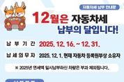 (시사미래신문) 인천 서구는 2025년 12월 정기분 자동차세 15만 3천599건, 198억여 원을 부과하고 11일 고지서를 일괄 발송했다고 밝혔다. 자동차세는 차종에 따른 일정액이나 배기량에 cc당 세액을 곱해 산출하는 차량별 연세액을 기준으로 1년에 상·하반기로 나누어 2회(6월, 12월) 정기적으로 부과한다. 이번 12월 정기분 자동차세는 7월 1일부터 12월 31일까지 소유 기간에 대한 부과분으로 과세기준일(12월 1일) 현재 자동차 등록 원부상 서구에 등록된 차량(자동차, 이륜차, 기계장비) 소유자에게 부과된다. 자동차세 연세액을 미리 선납한 차량과 연세액이 10만 원 이하로 6월에 일괄 부과된 차량은 제외된다. 고지서는 우편으로 발송되며 전자고지 신청자는 전자우편 또는 모바일앱에서 확인할 수 있다. 납부 기간은 12월 16일부터 12월 31일까지다. 자동차세는 전국 금융기관 ATM/CD기, 위택스, 지로등 인터넷, 보이는 ARS를 통해 조회·납부가 가능하며 지방세입 계좌 및 가상계좌로 이체할 수 있다. 고지서를 받지 못했거나 분실했을 경우 전국 금융기관 ATM/C