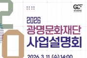 (시사미래신문) (재)광명문화재단은 2026년 (재)광명문화재단 사업설명회를 3월 11일 오후 2시 광명시민회관 리허설룸에서 개최한다. 이번 설명회는 광명문화재단의 2026년 비전 및 추진 방향을 시작으로 지역(생활) 문화, 공연·전시, 문화예술교육 및 지원, 문학 사업 소개와 참가자 질의응답 순서로 진행된다. 특히 재단에서 진행하는 공모사업을 ‘2026 광명문화재단 문화예술지원 사업 통합공모’로 묶어 소개하여 각 프로그램의 주요 내용, 운영 일정, 신청 방법 등 정보를 자세하고 정확하게 접할 수 있다. (재)광명문화재단 송은영 대표이사는“재단이 준비한 다양한 사업을 시민 여러분께 직접 소개하고 의견을 듣는 뜻깊은 자리”라며 “이번 사업설명회를 통해 더 많은 분들이 관심을 갖고 여러 사업에 편하게 참여해 주시면 좋겠다.”라고 밝혔다.