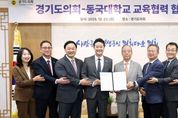 (시사미래신문) 경기도의회는 23일 오전 의장 접견실에서 동국대학교와 교육협력 및 학술교류를 위한 업무협약(MOU)을 체결했다. 이날 협약식에는 김진경 의장(더민주, 시흥3)과 고준호 의원(국민의힘·파주1), 김완규 의원(국민의힘·고양12), 이병숙 의원(더민주·수원12), 박호순 의정국장이 참석했다. 동국대학교에서는 윤재웅 총장, 김용현 교무부총장, 김승용 대학원장, 유한림 BMC(바이오메디캠퍼스) 행정처장 등이 함께 자리해 협약의 의의를 더했다. 양 기관은 이번 협약을 계기로 ▲의정 발전을 위한 정보 교류 ▲전문 인재 양성을 위한 교육·연구 지원 ▲도의원 및 의회 직원 대상 대학원 장학금 지원 등 의정 활동 역량 강화를 위한 체계적인 교육 협력에 나서기로 했다. 윤재웅 총장은 “대학의 교육·연구 역량을 공유함으로써 경기도 발전에 기여할 수 있게 되어 뜻깊다”며 “경기도의회와의 지속적인 협력을 통해 실효성 있는 교육 지원을 이어갈 수 있도록 최선을 다하겠다”라고 말했다. 김진경 의장은 “의회에 대한 도민의 기대는 점점 더 복잡해지고 다양화되고 있는 만큼 의회 구성원 모두가 더 많이 배