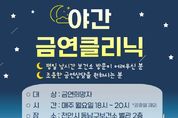 (시사미래신문) 천안시 동남구보건소는 새해를 맞아 오는 11월까지 야간 금연클리닉을 운영한다고 8일 밝혔다. 야간 금연클리닉은 시간적 제약으로 금연클리닉 이용이 어려운 직장인 등을 위해 마련됐으며, 매주 월요일에는 오후 8시까지 이용이 가능하다. 금연클리닉에 방문하면 금연상담사와의 면담을 통해 금연 계획, 금단현상 대처 방법 상담, 금연행동 요법, 단계별 금연보조제(니코틴 패치), 6개월간의 대면·전화·문자 상담 등을 지원받을 수 있다. 박혜경 동남구보건소장은 “주민들이 편리하게 금연지원서비스를 이용할 수 있도록 금연 환경을 조성해 건강증진에 도움이 되길 바란다”고 말했다.