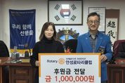 (시사미래신문) 안성시동부무한돌봄네트워크팀은 지난 26일 국제로타리 3600지구 안성로타리클럽으로부터 촘촘한 복지 안전망 구축을 위한 후원금 100만 원을 전달받았다. 안성로타리클럽은 매년 지역사회를 위한 봉사와 나눔을 실천하며 지역 발전에 기여해 왔으며, 이번 후원금은 복지 사각지대 발굴과 사례관리 대상자에게 전문적인 복지 서비스를 제공하는 데 사용될 예정이다. 안성로타리클럽 이승재 회장은 “현장에서 발로 뛰며 소외된 이웃을 찾는 안성시동부무한돌봄네트워크팀의 활동에 실질적인 도움이 되길 바란다”며 “앞으로도 지역사회의 다양한 사회공헌 프로젝트를 통해 지역 복지 서비스의 질을 높이는 마중물이 되겠다”고 말했다. 안성시동부무한돌봄네트워크팀 정은주 센터장은 “복지 사업을 더욱 안정적이고 원활하게 추진할 수 있도록 도움을 주신 안성로타리클럽에 깊이 감사드린다”며 “지역 주민에게 필요한 맞춤형 복지 서비스를 제공하는 데 최선을 다하겠다”고 말했다