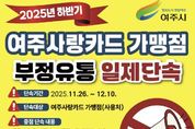 (시사미래신문) 여주시는 지역화폐인 여주사랑카드의 부정유통 근절을 위해 지난 11월 26일부터 오는 12월 10일까지 집중 단속에 나선다고 밝혔다. 주요 단속 대상은 ▲ 물품의 판매 또는 용역의 제공 없이 지역화폐를 수취·환전하는 행위 ▲ 실제 매출금액 이상의 거래를 통하여 지역화폐를 수취·환전하는 행위 ▲ 가맹점이 등록 제한업종을 영위하는 경우 ▲결제를 거부하거나 다른 결제 수단에 비해 불리하게 대우하는 행위 ▲기타 단속이 필요성이 있다고 인정되는 경우 등이다. 이번 일제 단속은 가맹점 데이터 목록을 참고 및 주민 신고 등을 토대로 의심되는 현장을 방문해 확인하는 방식으로 진행된다. 여주시 일자리경제과 관계자는 “지역화폐 제도의 지속가능성, 신뢰성을 확보하고 지역 자금의 역외유출 방지를 위해서는 여주사랑카드 사용자와 가맹점주 모두 함께 힘을 합쳐야 건전한 유통 문화를 만들어갈 수 있다”협조를 당부했다. 부정유통 적발 시 여주사랑카드 가맹점 등록취소, 관계 법령에 따라 최대 2,000만원 이하의 과태료가 부과될 수 있으며, 위반행위 조사를 거부·방해 또는 기피하는 경우에도 최대 500만원 이하의 과