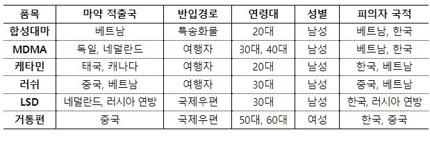 연령대별 주요 밀수품목을 살펴보면, ❶10대는 국제우편으로 반입한 시비디(CBD)오일 · 대마카트리지 등, ❷20∼40대는 해외직구를 이용한 케타민 · MDMA 등 파티용 마약류, ❸50대 이상은 여행자를 통한 대마초 · 거통편 등이다.