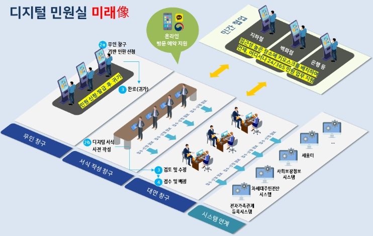 또한, 정부24 기반의 무인창구를 설치하여 즉시 발급·처리되는 간단한 민원은 시간·공간 제약 없이 신청 가능하게 되며,