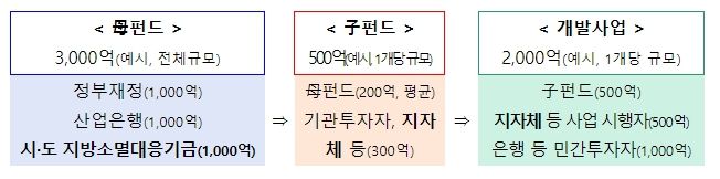지역활성화 투자 펀드는 지역·민간 주도의 대규모 투자를 신속 추진하기 위해 마련된 제도로, 민간투자의 마중물 역할을 하는 모펀드는 정부재정(1,000억)과 산업은행 출자(1,000억), 그리고 지방소멸대응기금(광역계정, 1,000억)으로 총 3,000억 원 규모로 올해 최초로 조성된다.