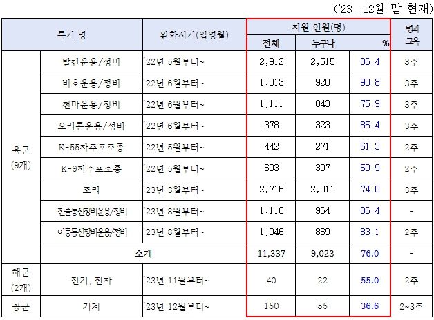 이렇게 조리병 등 12개 특기의 지원자격 완화를 통해 해당 특기 지원자 전체 11,527명의 78.9%에 달하는 인원(9,100명)이 관련 분야 전공 또는 자격·면허없이 적성과 취미를 살려 지원할 수 있었다.