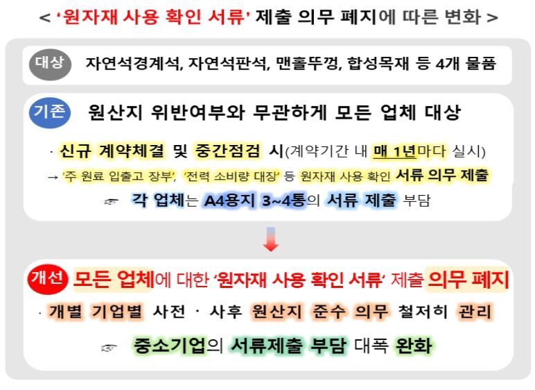원자재 사용 확인 서류 의무 제출은 제도 시행 후 서류 준비 등으로 인한 시간 소요·비용 발생으로 관련 업계에 부담으로 작용해왔다.