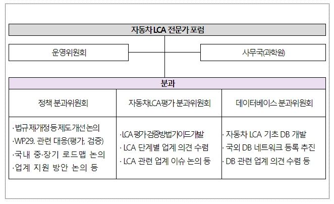 우리나라도 이러한 국제 동향에 선제적으로 대응하기 위해 올 1월에 ‘대기환경보전법’에 자동차 온실가스 전과정평가의 근거를 마련했으며, 지난해부터 산업계, 학계 및 연구기관이 모두 참여하는 ‘자동차 온실가스 전과정평가 환경포럼’을 구성(2023.6.)하여 업계와 지속적으로 소통하고 있다.