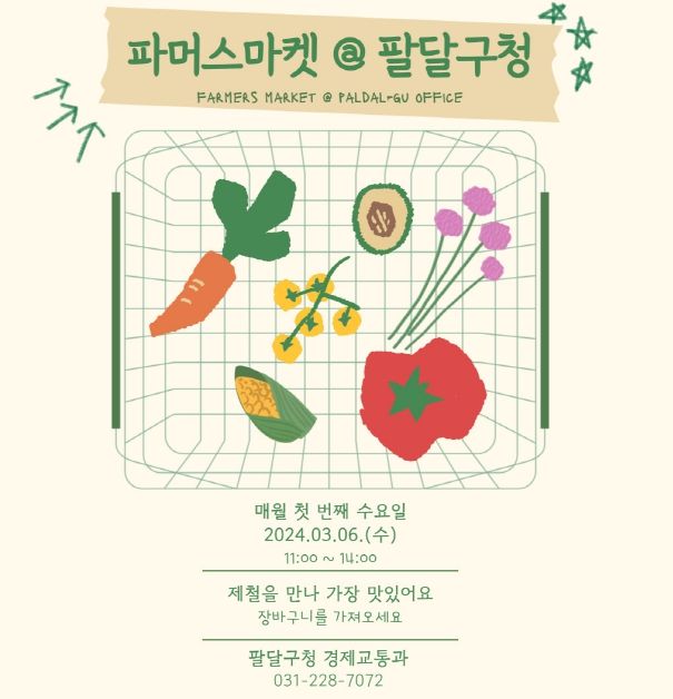 한편, ‘2024 팔달구 파머스마켓’은 매월 첫 번째 수요일에 개최하며, 행사 시간은 오후 12시 30분부터 15시 30분까지 운영된다.