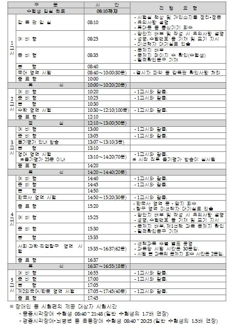 7. 영어 영역의 경우 총 45문항 중 듣기평가는 17문항이며, 25분 이내 실시한다.