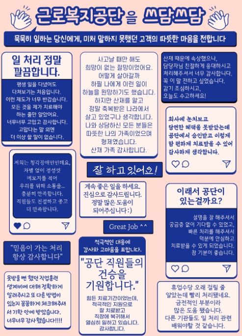 또 수집된 의견 중 약 28.3%는 업무를 처리한 공단 직원에게 전하는 고객의 감사인사로 나타났다. 한 고객은 “저희는 청각장애인인데, 정성껏 메모지를 적어 소통을 해주셨습니다.”라며 감동을 표현했으며, 한국어가 서툰 외국인 고객도 자국어로 진심 어린 감사인사를 남겨 눈길을 끌었다. 공단은 마음이 따뜻해지는 고객의 칭찬 글을 모아 공단이 보유한 온‧오프라인 매체를 통해 공유하는 “쓰담쓰담 캠페인”을 펼쳐 직원의 자긍심을 높이고 고객 중심 조직문화를 확산할 예정이다.