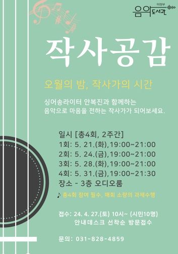 (시사미래신문) 의정부음악도서관은 음악을 더 깊이 있게 경험해 볼 수 있는 가사 쓰기 프로그램 ‘작사공감’을 5월 21일부터 31일까지 총 4회 운영한다.