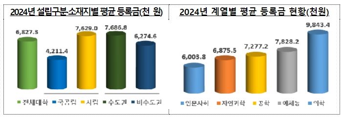 설립 유형별로는 사립은 6,250.2천 원, 공립은 2,376.8천 원이었으며, 소재지별로는 수도권은 6,622.3천 원, 비수도권은 5,830.3천 원이다.