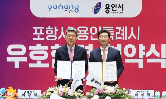 이상일 용인특례시장과 이강덕 포항시장은 이날 포항시청 대회의실에서 우호도시 교류 협약서에 서명했다.