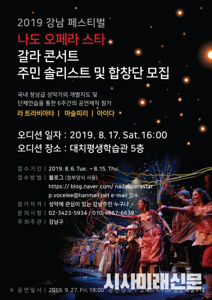 (시사미래신문) ‘기분 좋은 변화, 품격 있는 강남’을 구현 중인 강남구가 지난 6일부터 15일까지 2019 강남페스티벌 프로그램 중 하나인 ‘나도 오페라 스타’ 공연에 참여할 구민 솔리스트와 합창단원을 모집한다.