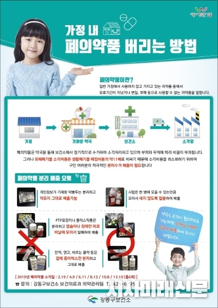 이에 강동구는 강동구약사회와 함께 가정 내 폐의약품 수거 사업을 지속적으로 추진해오고 있다. 가정 내 폐의약품을 관내 약국에 비치된 ‘폐의약품 수거함’에 버리면 보건소가 두 달에 한 번 ‘폐의약품 수거의 날’에 수거하여 소각 처리한다. 이러한 방식으로 지난해에만 총 2,890kg의 폐의약품이 수거·폐기됐다.