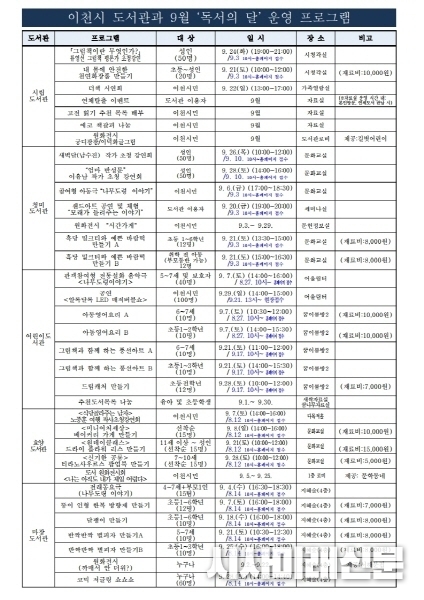 독서의 달 프로그램을 9월 한 달 간 이천시 공공도서관에서 운영될 예정이며 시민들에게 도서관에서 즐기며 배우고 함께하는 다양한 기쁨을 선사할 것이다.
