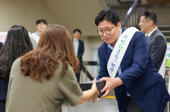 도성훈 교육감은 간부 공무원들과 함께 청렴 문구가 적힌 어깨띠를 착용하고 출근 시간에 맞춰 직원들에게 청렴 홍보물을 직접 배부했다.