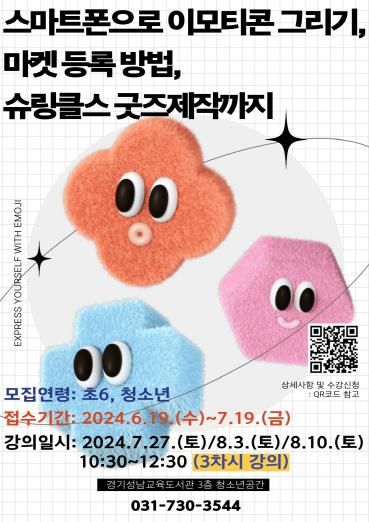 주요 과정은 ‘스마트폰 하나로 만드는 나만의 북모티콘과 굿즈’를 주제로 독후활동과 창작활동을 함께 진행한다. ▲책 속 인물의 감정, 상황, 성격 표현 스케치 ▲핸드폰을 활용한 이모티콘 제작 ▲나만의 캐릭터 굿즈 제작 ▲이모티콘 마켓 업로드 방법 배우기 등이다.