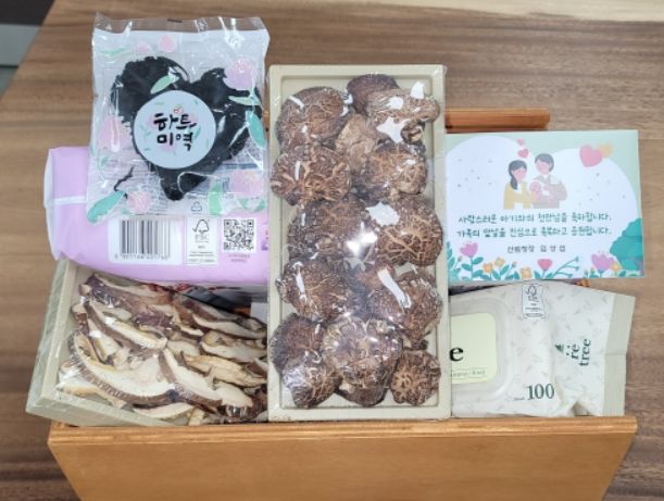 출산가정의 새 생명 탄생을 축하하는 출산용품 꾸러미에는 철분 등의 영양소가 풍부한 임산물인 표고버섯과 신생아용 기저귀, 물티슈 등이 담겼다.