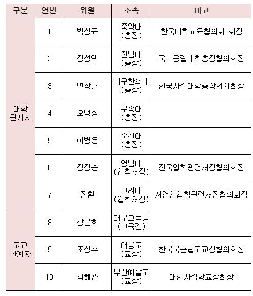 교육부는 지난해 12월에 발표한 「2028 대학입시제도 개편안」의 안정적인 정착과 현장 중심의 대입전형 개선 과제 발굴을 지원하기 위해 이번 협의회를 출범했으며, 본회의 위원으로 전문성과 대표성을 가진 대학 총장, 입학처장 등 대학 관계자와 교육감, 교장 등 고교 관계자 10인을 위촉했다.