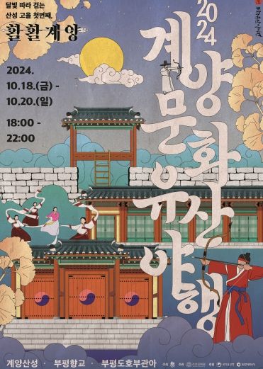 ‘2024 계양 문화유산 야행’은 삼국시대부터 중요한 군사적 요충지였던 계양산성을 필두로 유생들이 활을 통해 정신을 수련했던 부평향교, 그리고 정조대왕이 들려 활을 쏜 부평도호부관아까지 세 곳의 계양 문화유산을 ‘활’을 통해서 바라본다. 계양의 역사를 담은 미디어 파사드쇼, 연무정의 궁도 체험, 계양 역사 인물 마당극, 스탬프 투어, 코베아 옥상 시네마, 야간 포토존, 계양구 공방 플리마켓 등 누구나 쉽고 재미있게 즐길 수 있는 다채로운 행사가 풍성하게 마련됐다.