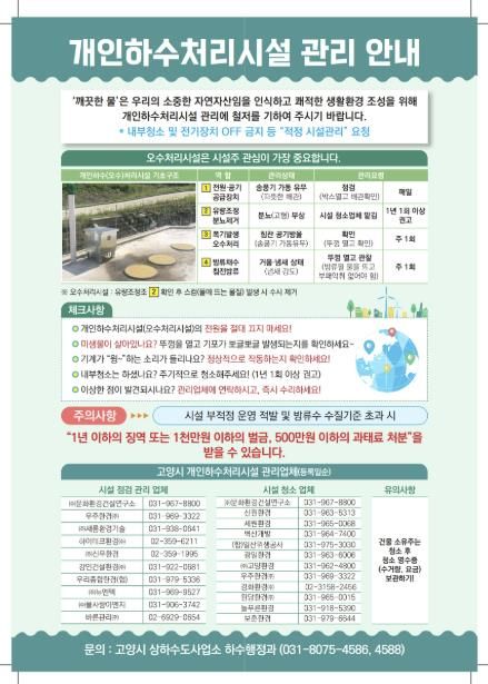 고양시는 개인하수처리시설을 더욱 체계적으로 관리하기 위해 지난 2020년 실태 전수조사를 실시했고, 조사를 통해 확인된 미신고시설을 적법한 시설로 등록 전환하는 ‘미신고 개인하수처리시설 양성화사업’을 추진 완료했다.