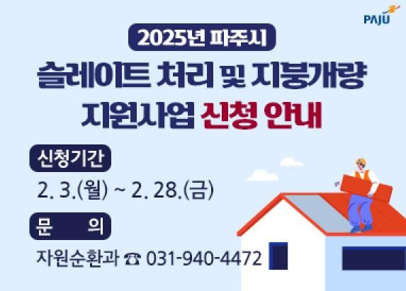 (시사미래신문) 파주시는 노후 슬레이트 주택에 대한 시민건강 피해를 예방하고 쾌적한 생활환경을 조성하고자 2025년 슬레이트 철거 및 지붕개량 사업을 실시한다.