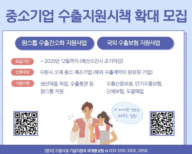 수원시 관계자는 “미국 관세 대응 특화시책이 수출 중소제조기업에 도움이 되길 바란다”며 “미국의 관세 정책으로 인한 수출 기업의 피해를 최소화할 수 있도록, 적극적으로 대응하겠다”고 말했다.