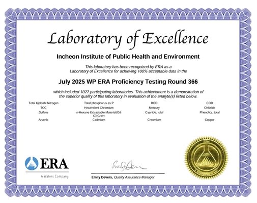 (시사미래신문) 인천광역시 보건환경연구원은 미국 환경자원협회(ERA)가 주관한 2025년 환경분야 국제숙련도 평가에서 ‘최우수 등급(Laboratory of Excellence)’을 받았다고 밝혔다.