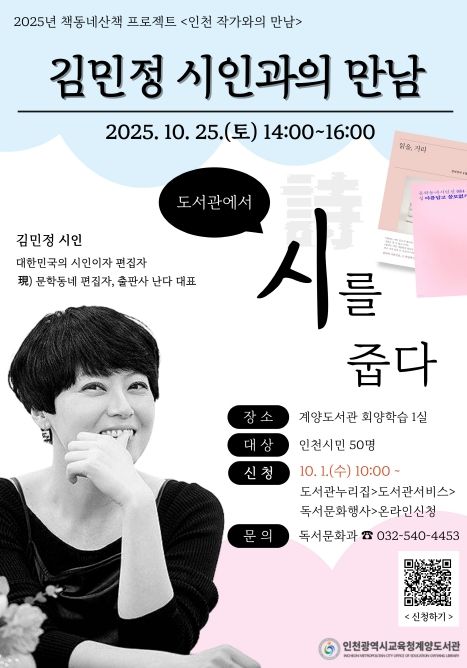 (시사미래신문) 인천광역시교육청계양도서관은 10월 25일 오후 2시 ‘책동네산책 프로젝트’의 일환으로 ‘김민정 시인과의 만남’을 개최한다.