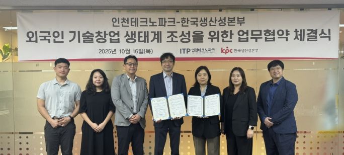 (시사미래신문) 인천테크노파크는 지난 16일 한국생산성본부와 ‘외국인 창업 활성화 및 창업 생태계 조성을 위한 업무협약(MOU)’을 체결했다.