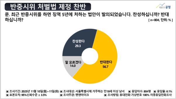 펜앤마이크가 여론조사 전문기관 여론조사공정(주)에 의뢰해 지난 10일과 11일 이틀간 서울시에 거주하는 만18세 이상 남녀 805명을 대상으로 '반중시위 처벌법'에 대해 물은 결과, 이에 찬성한다는 응답이 29.3%, 반대한다는 응답이 56.7%인 것으로 나왔다. '잘 모르겠다'는 14.0%였다.