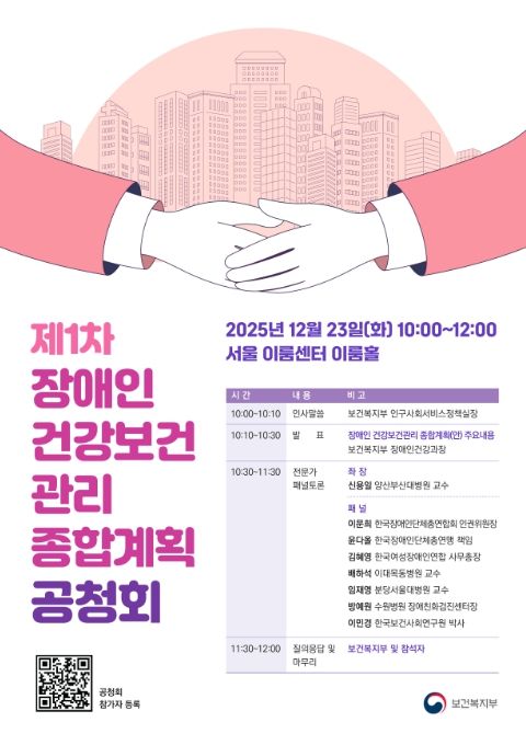 (시사미래신문) 보건복지부는 12월 23일 오전 10시 서울 여의도 이룸센터에서 ‘제1차 장애인 건강보건관리 종합계획(안)’에 대한 공청회를 개최했다.