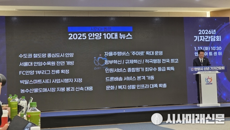 (시사미래신문) 안양시는 13일 오전 10시30분 만안구 안양아트센터에서 ‘2026년 신년 기자간담회’를 열고, 급변하는 행정환경과 인공지능(AI) 시대 전환에 대응해 도시의 미래 경쟁력을 높이며 시민의 일상 변화를 이끄는 시정에 역량을 집중하겠다고 밝혔다.