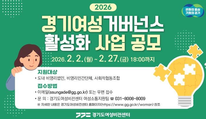 (시사미래신문) 경기도여성비전센터가 오는 2월 27일까지 경기여성거버넌스 활성화 공모사업 수행 단체를 모집한다.