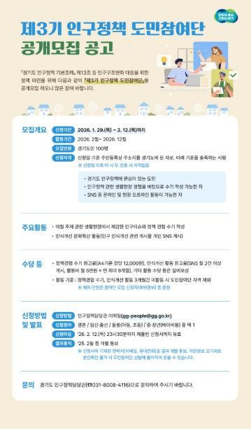 (시사미래신문) 경기도가 정책 대상자가 직접 정책개선에 참여하는 ‘제3기 인구정책 도민참여단’ 100명을 공개 모집한다.