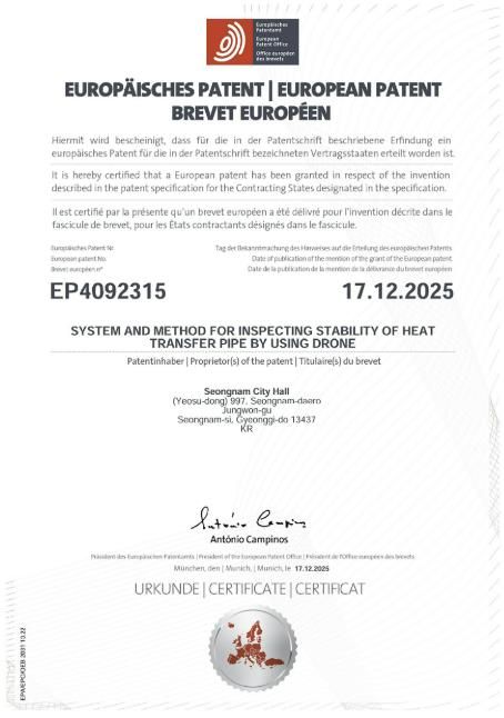 (시사미래신문) 성남시가 자체 개발한 ‘드론을 이용한 열수송관 안정성 검사 시스템’이 유럽특허(등록번호 EP4092315) 등록을 완료했다고 밝혔다. 이는 시 최초의 해외특허 등록 사례로, 지식재산의 해외 권리화를 통해 유럽 수출길을 여는 계기가 될 것으로 기대된다.