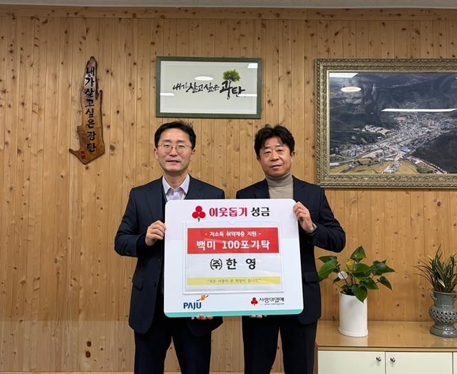 윤성보 ㈜한영 대표는 “설날을 맞아 지역 이웃을 돕기 위해 올해도 기부에 동참하게 됐다”라며 “앞으로도 지역의 취약계층에 도움이 되는 다양한 사회 공헌 활동을 이어가겠다”라고 말했다.