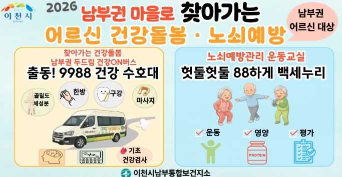 해당 프로그램은 2026년 2월부터 11월까지 매주 화요일과 수요일 오후 2시부터 4시까지 장호원읍, 설성면, 율면의 마을회관을 순회 방문할 예정이며, 참여를 원하는 마을은 마을 이장이 남부통합보건지소로 기간 내 상시 신청하면 된다.