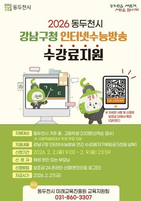 지원 대상은 동두천시에 거주하는 중·고등학생이며, 정부24를 통해 2월 9일 23시 59분까지 신청할 수 있다. 수강권은 2월 27일 지급될 예정이며, 신청 방법과 자세한 사항은 정부24 누리집에서 확인할 수 있다.