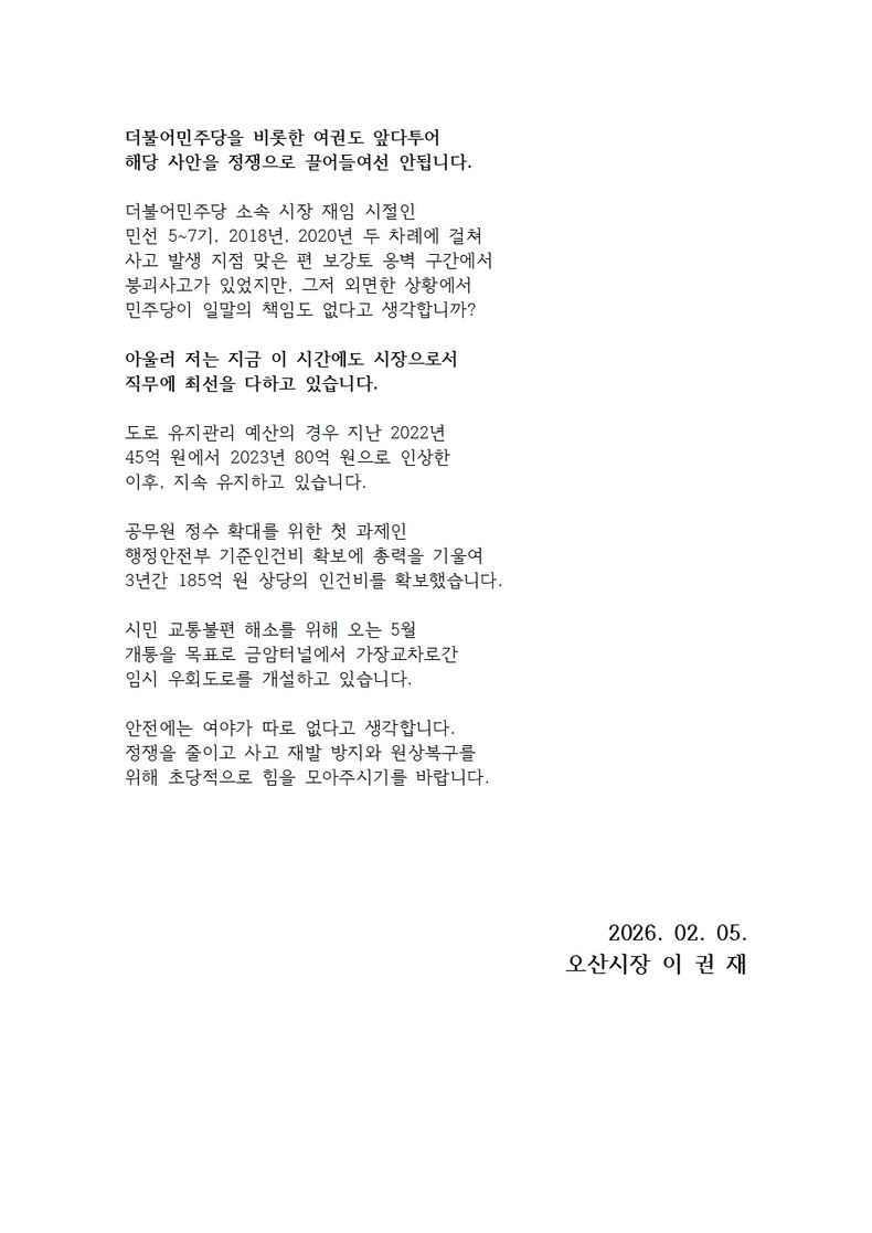 이 시장은 “현재도 시장으로서 시정 운영에 최선을 다하고 있다”며 “사고 수습과 재발 방지, 원상 복구에 행정 역량을 집중하겠다”고 밝혔다. 이어 “안전 문제에는 여야가 따로 있을 수 없는 만큼, 정쟁을 줄이고 초당적으로 협력해 달라”고 당부했다.
