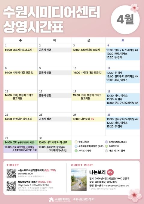 수원시미디어센터 관계자는 “이번 업무협약을 통해 누구나 차별 없이 문화를 접하고 누릴 수 있는 환경을 조성하고자 한다”며, “4월 장애인의 날을 맞아 운영하는 기념 프로그램을 시작으로, 배리어프리 영화 상영을 지속 확대해 나가겠다”고 밝혔다.