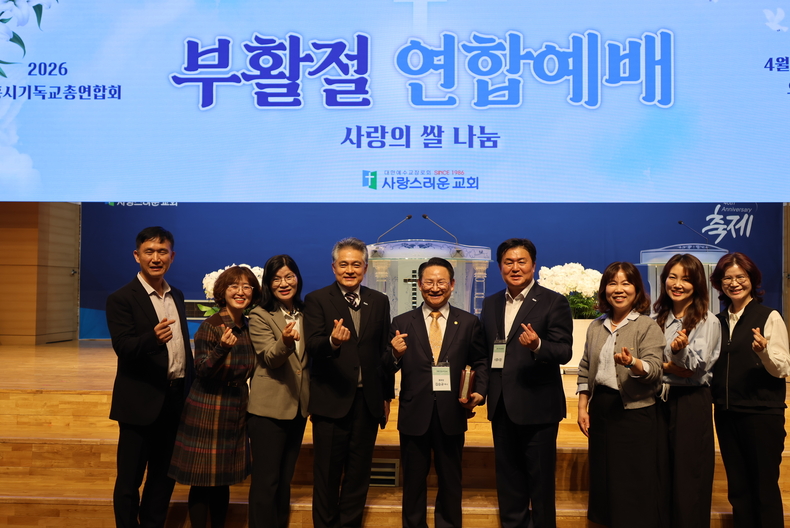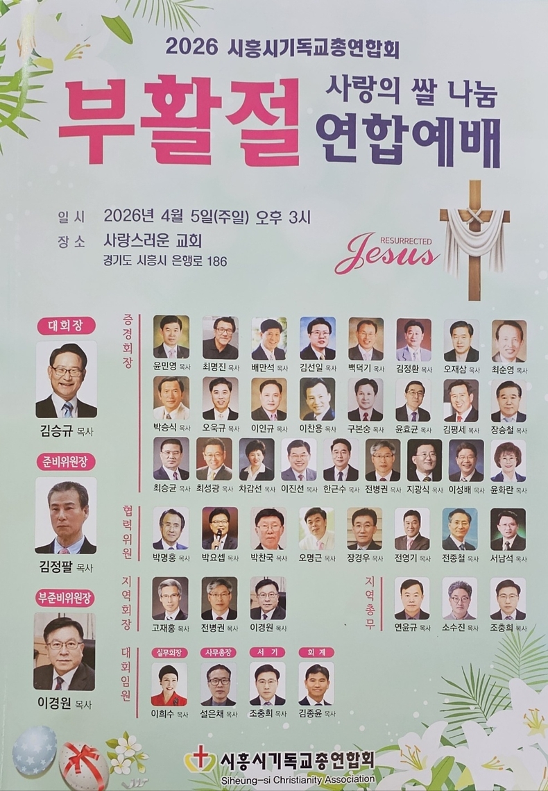 시흥시기독교총연합회는 4월 5일 오후 3시 사랑스러운교회에서 2026년 부활절 연합예배 및 사랑의 쌀 나눔 행사를 개최했다. 이날 행사에는 지역 교회 성도들과 시흥시 관계자, 지역 인사들이 참석해 부활의 기쁨을 함께 나누고 어려운 이웃을 위한 나눔 행사를 진행했다.
